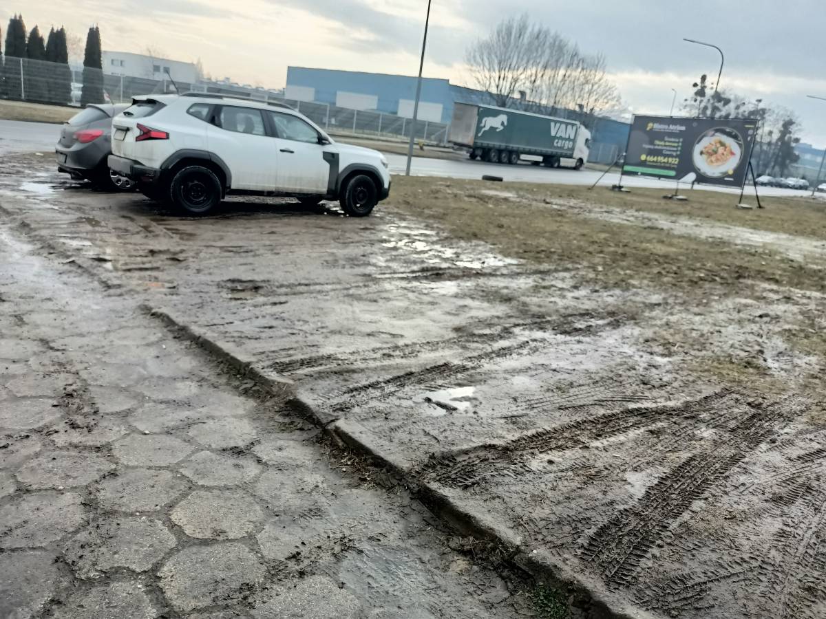 Przemysłowa 45, nielegalny parking na trawniku, choć trudno go teraz nazwać trawnikiem, błoto i kolejny po parkujących samochodach.