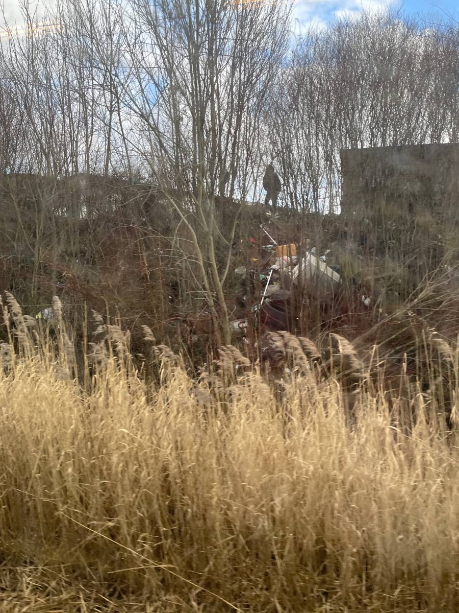 Wielkie dzikie wysypisko- opony, meble, lodówki, butelki, substancje. Proszę o zainteresowanie się tą sprawą i/lub ewentualne poinformowanie PKP o znacznym zaśmiecaniu śmieciami wielkogabarytowymi w bardzo dużej ilości. Zachęcam do wizji w terenie bo na prawdę wygląda to bardzo źle. Zdjęcie zrobione z pociągu od strony kolei. Śmieci jest kilkunastokrotnie więcej niż widać na zdjęciu… Jest możliwość dojścia do terenu od strony garaży.