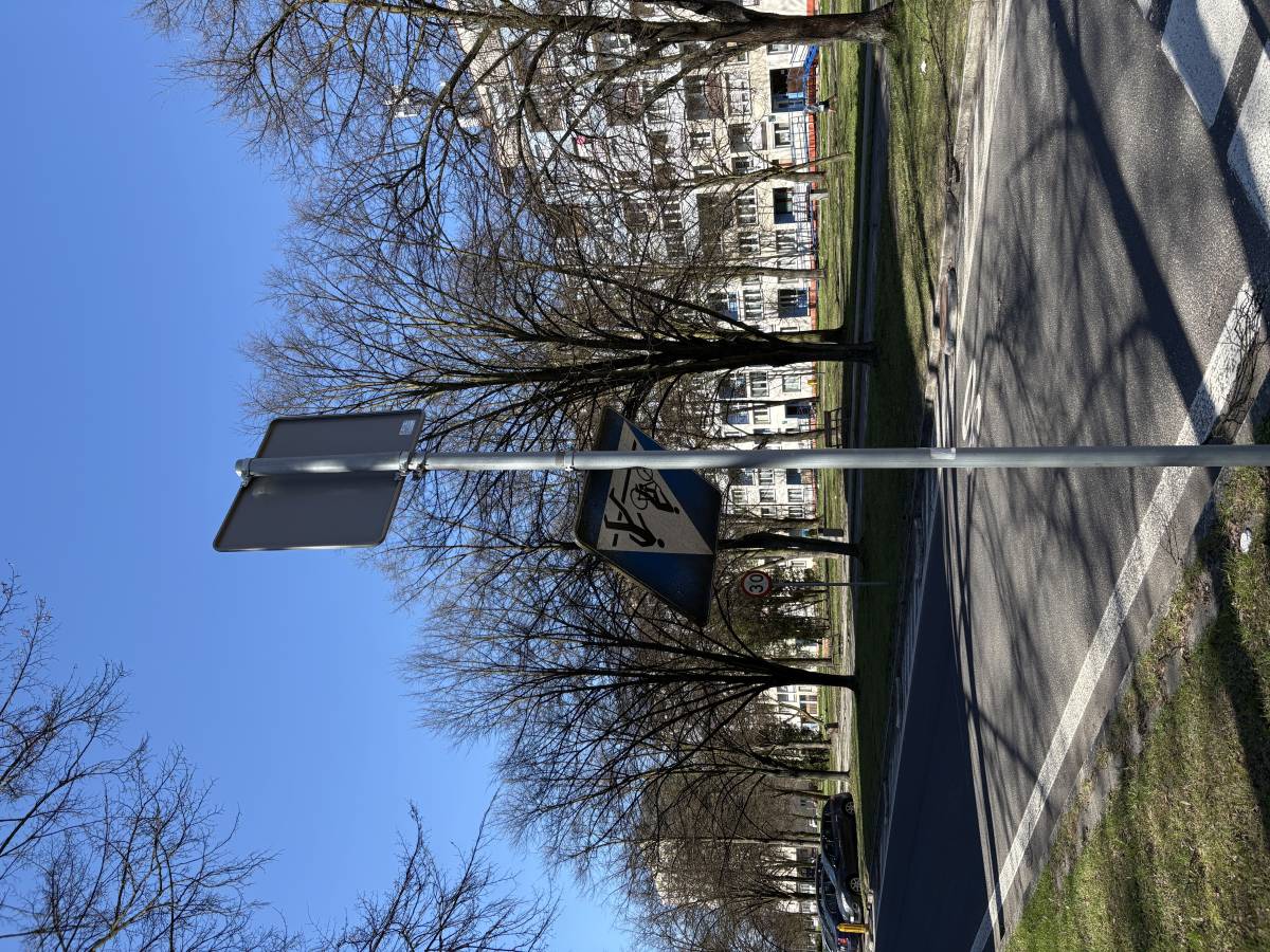 Na skrzyżowaniu Niepodległości i Darwina wisi znak drogowy info o przejściu dla pieszych.