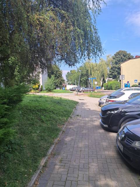Zwisające gałęzie drzewa utrudniają poruszanie się po chodniku