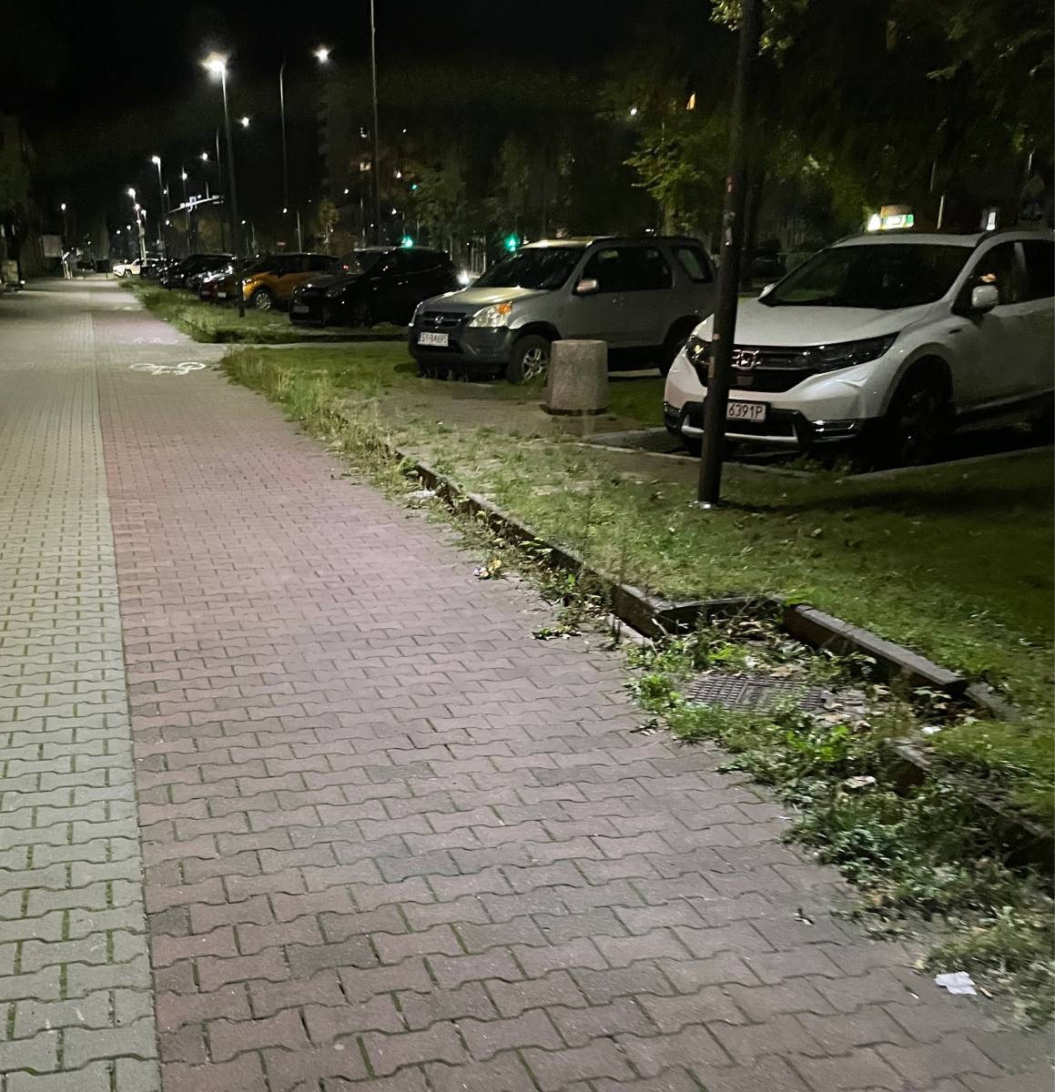 Zarośnięte obrzeża ścieżki rowerowej i chodnik wzdłuż parkingu Tychy al. Bielska