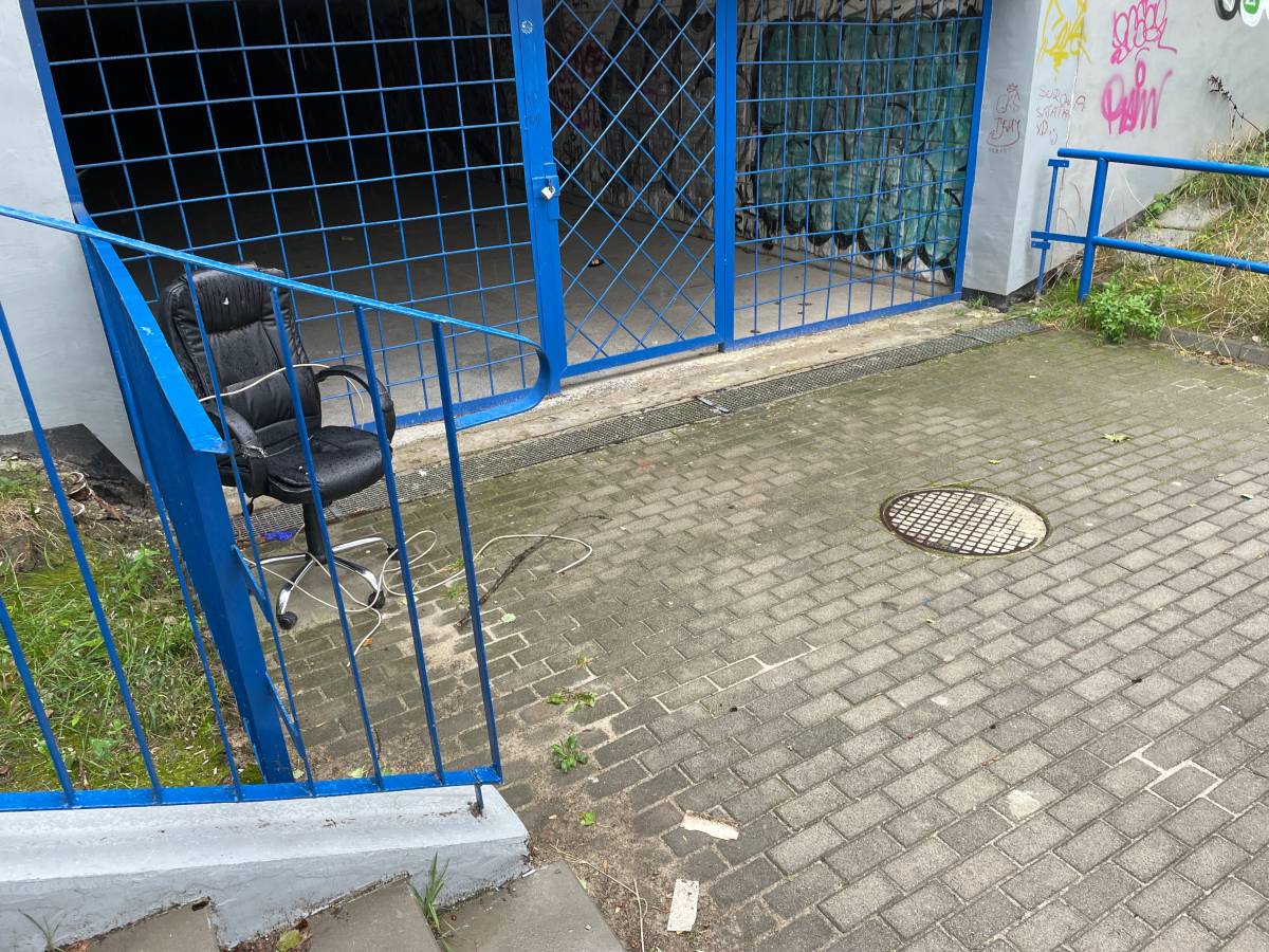 1. Przy wejściu stoi porzucony fotel obrotowy