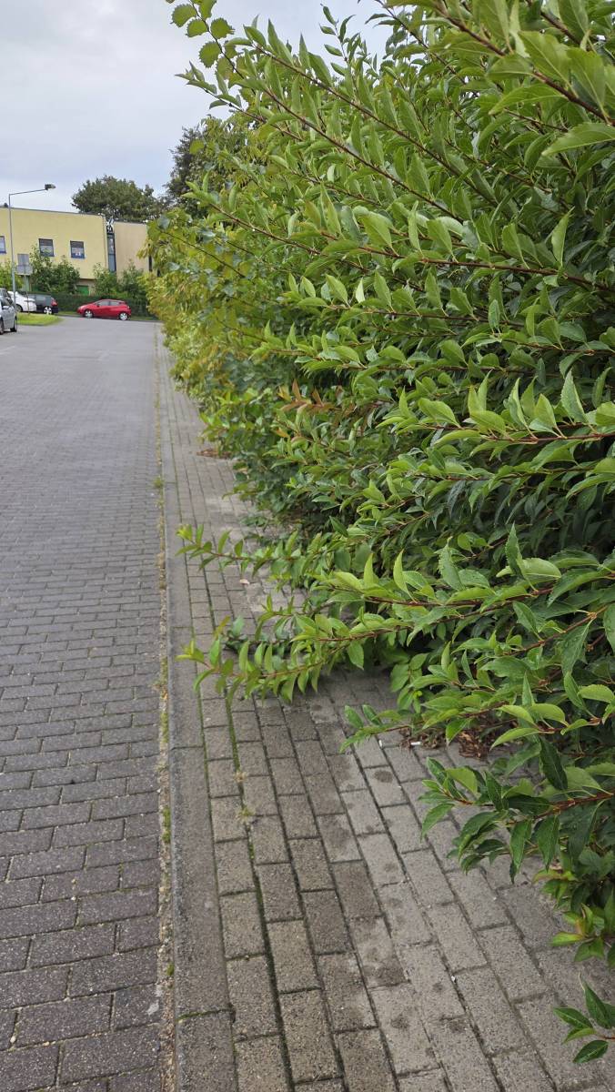 Proszę o przycięcie krzaków aby dało się korzystać z chodnika, aby nie trzeba bylo chodzić pomiędzy jeżdżącymi samochodami na terenie parkingu.