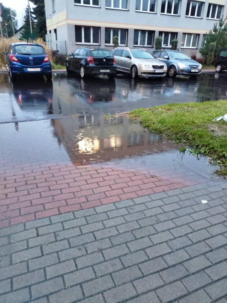 Jeden z lokatorów zgłasza, że podczas opadów na chodniku / wyjeździe tworzy się duże zalewisko którego nie sposób obejść bez przemoczenia butów. Prosi o interwencję i naprawę chodnika w wskazanym miejscu.