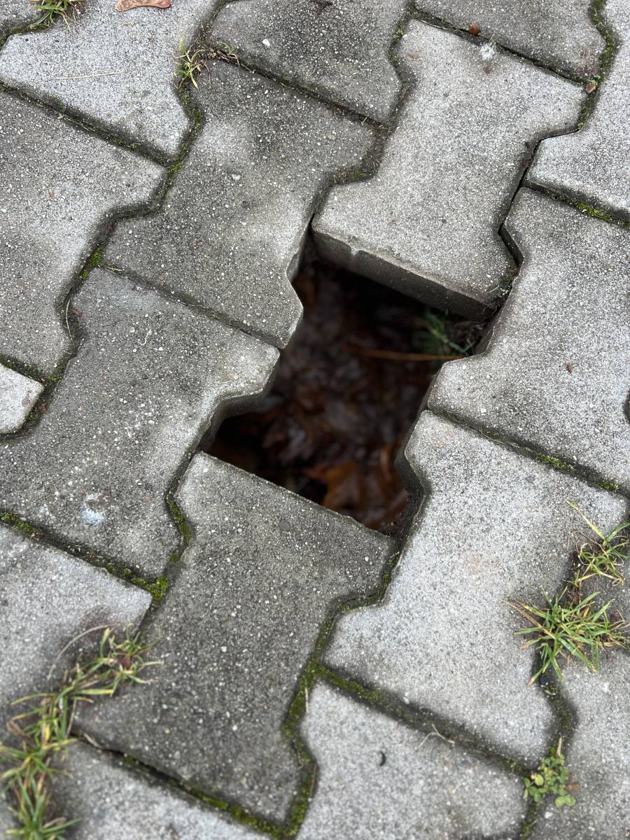 Dziura w chodniku na ok 30 cm pod brakującym puzlem