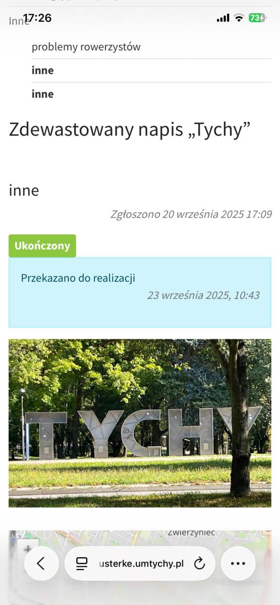 We wrześniu zgłosiłem że napis Tychy jest w złym stanie wizualnym. Namalowane są na nim wulgarne bazgroły, oklejony jest naklejkami. Po dziś dzień został nie tknięty, mało tego powieszono napis „Wesołych Świąt” tuż nad wulgarnymi napisami i namalowanym na centralnie na środku męskim narządem- takie życzenia brzmią jak obrzydliwy, absolutnie nie śmieszny żart! Czy ktoś nad tą sytuacją panuje żeby od pół roku wizytówką miasta była zdewastowana… Proszę o pilną interwencję nie za 3 miesiące czy dwa lata. To praca na góra dwie godziny-nie rozumiem jaki jest problem żeby w sposób chemiczny usunąć te bazgroły i dlaczego trwa to od września, a zniszczony napis jest od maja/czerwca.