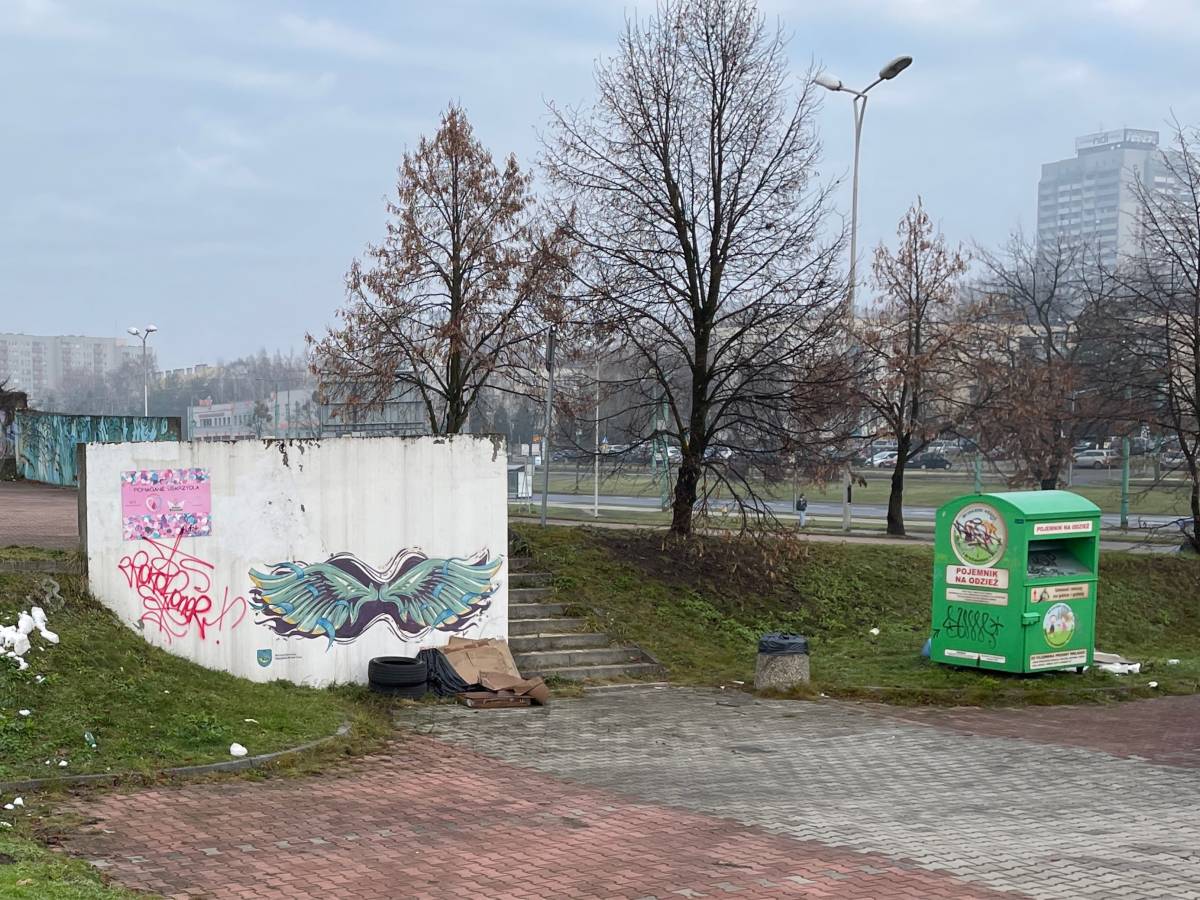 Proszę o zlecenie uprzątnięcia tych opon i śmieci zlokalizowanych przy schodach oraz za kontenerem na odzież.