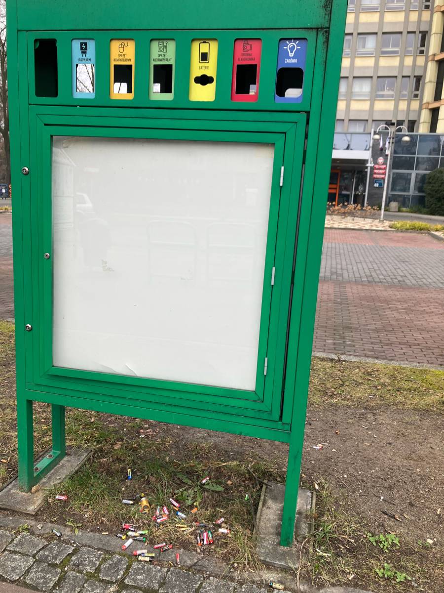 Pod urzędem miasta leżą na trawniku wysypane zużyte baterie.