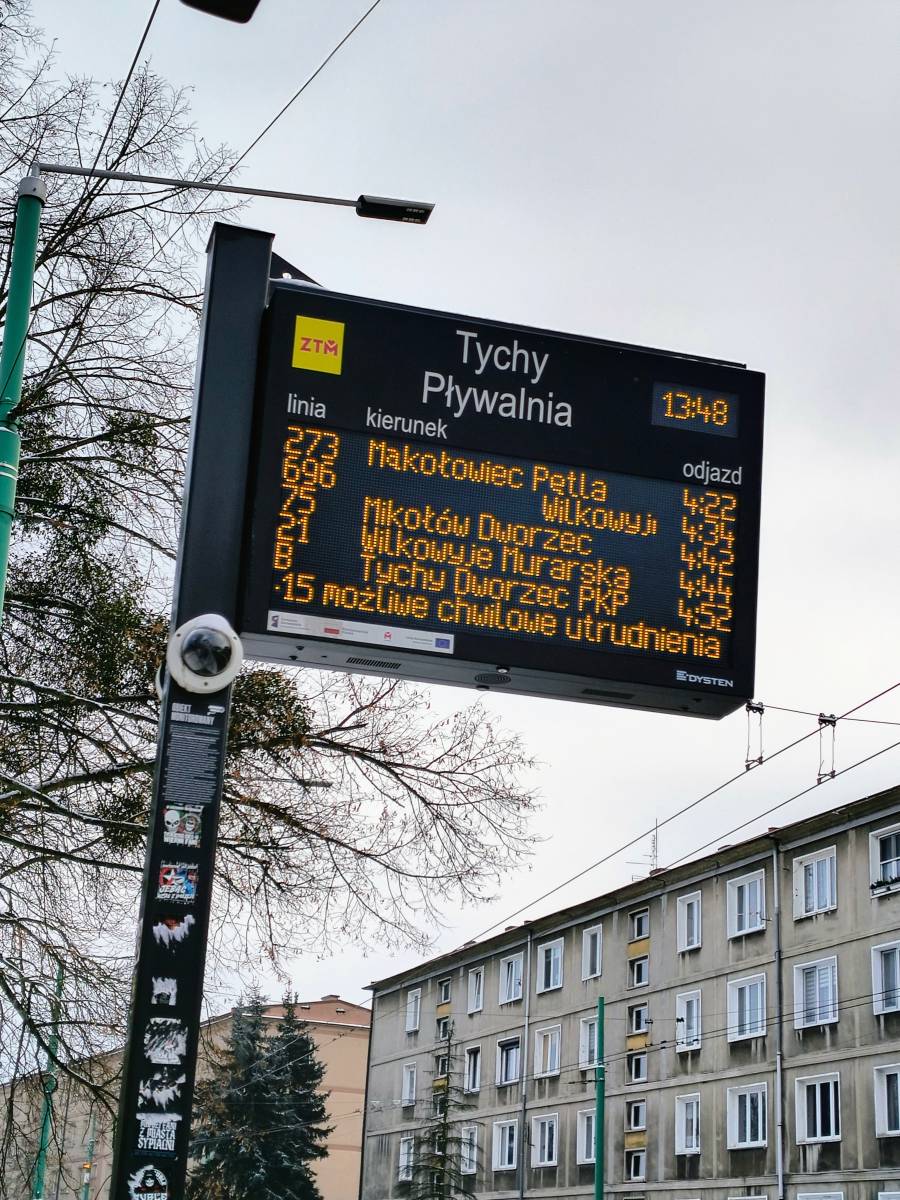 Zawieszony system informacji pasażerskiej na przystanku Tychy Pływalnia.