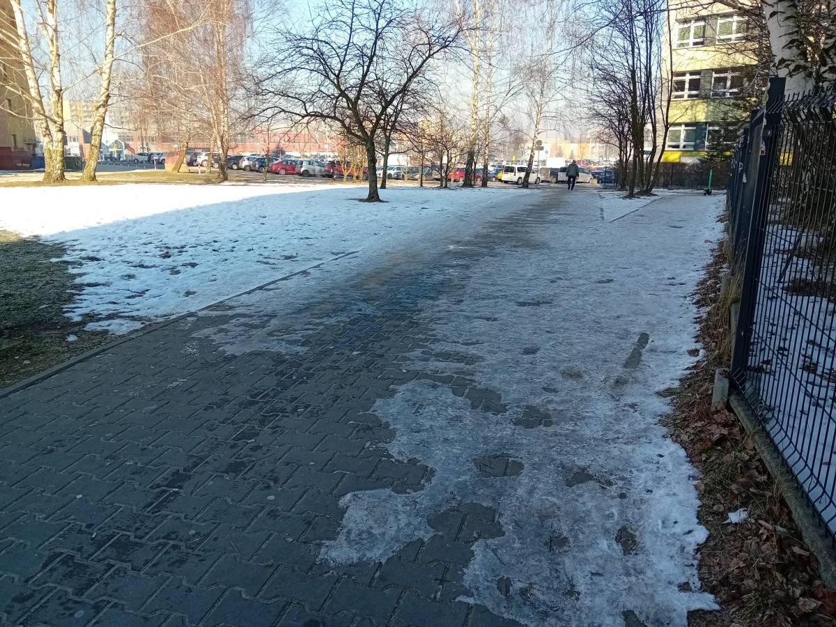 Mieszkańcy osiedla "U" zgłaszają w administracji Rejonu GZM nr 7 TSM "OSKARD", że chodnik wzdłuż płotu do Tyskich Hal Targowych jest nie posypany i oblodzony. Jest bardzo ślisko, mieszkaniec przewrócił się. Prosimy o szybką interwencję w tej sprawie i posypanie tego chodnika, żeby nikomu z mieszkańców nic się nie stało.