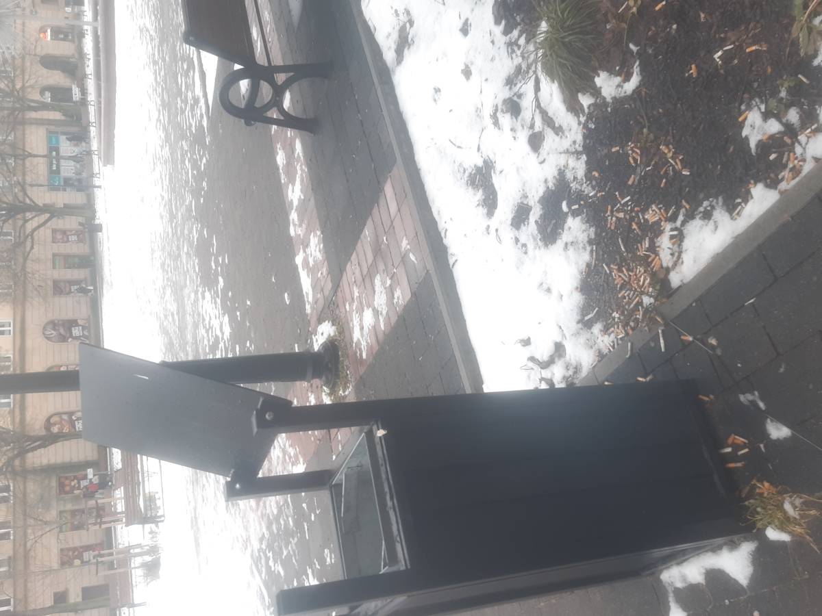 Pl.Baczynskiego przy koszach pełno petów.Firma nie zamyka pokrywy tych koszy jak również przy ich otwieraniu pety ładują na chodniku.zdjecie zrobione 18.02
