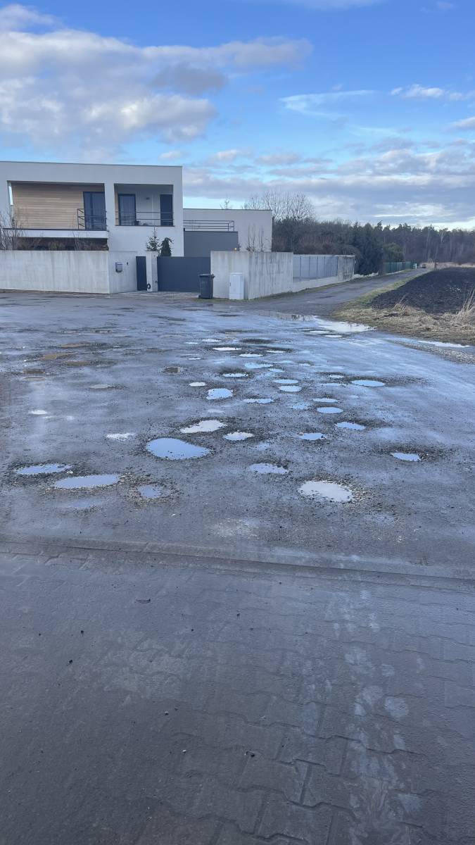 Liczne dziury na drodze utwardzonej dojazdowej