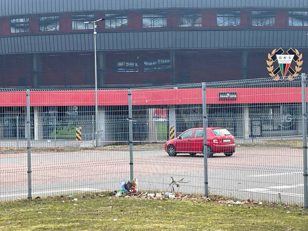 Porozrzucane śmieci wzdłuż ogrodzenia stadionu Tychy ul. Edukacji