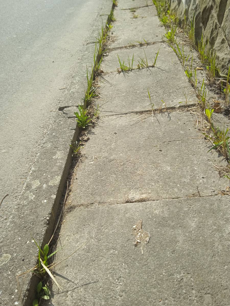 Uszkodzony i zapadający się chodnik. Rosną chwasty