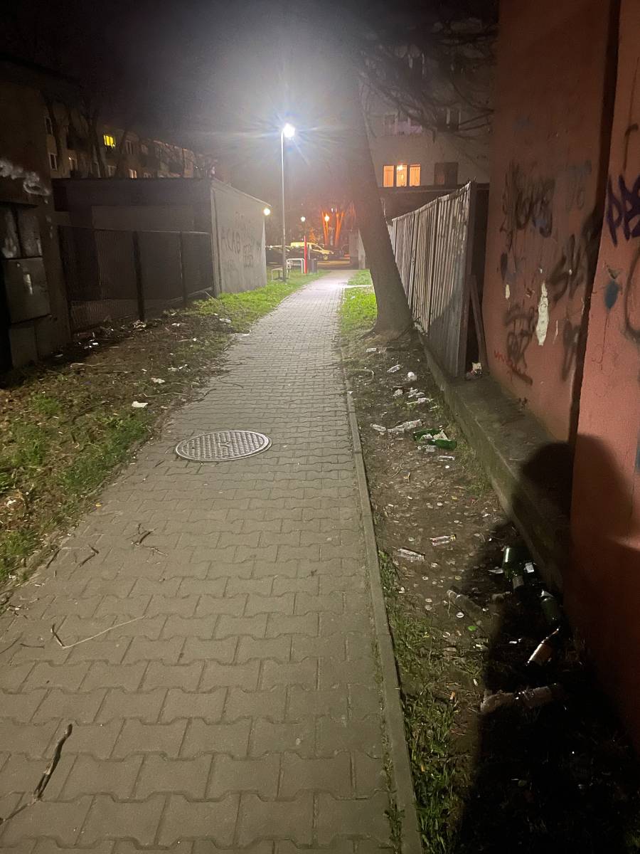 Proszę o zlecenie uprzątnięcia terenu wokół chodnika- pełno porzuconych butelek po alkoholu.