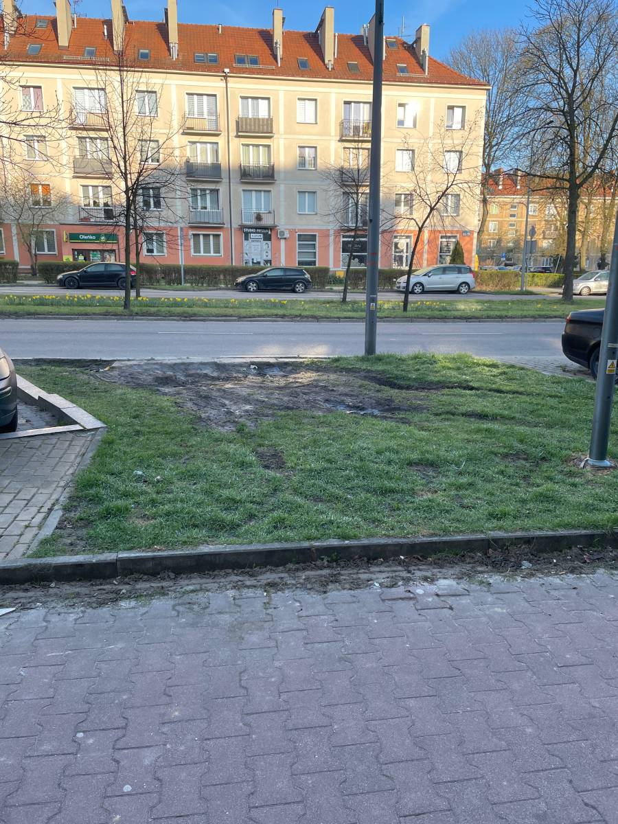 Na wysokości żabki zniszczone trzy wysepki między parkingami. Proszę o zlecenie przywrócenia zieleni do pierwotnego stanu i najlepiej zablokowania możliwości wjazdu.