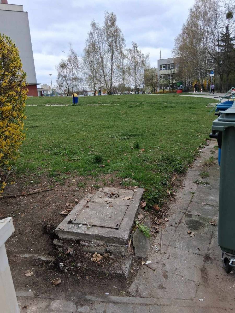 Przy wiacie śmietnikowej w okolicy budynków przy ul. Uczniowskiej 12-14 uszkodzona jest studnia teletechniczna - widoczna dziura oraz pręty.