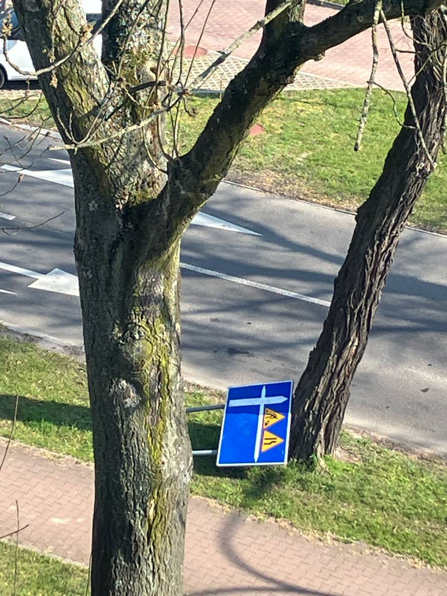 Na wysokości numeru 60 al. Niepodległości w Tychach leży przewrócony znak drogowy.
