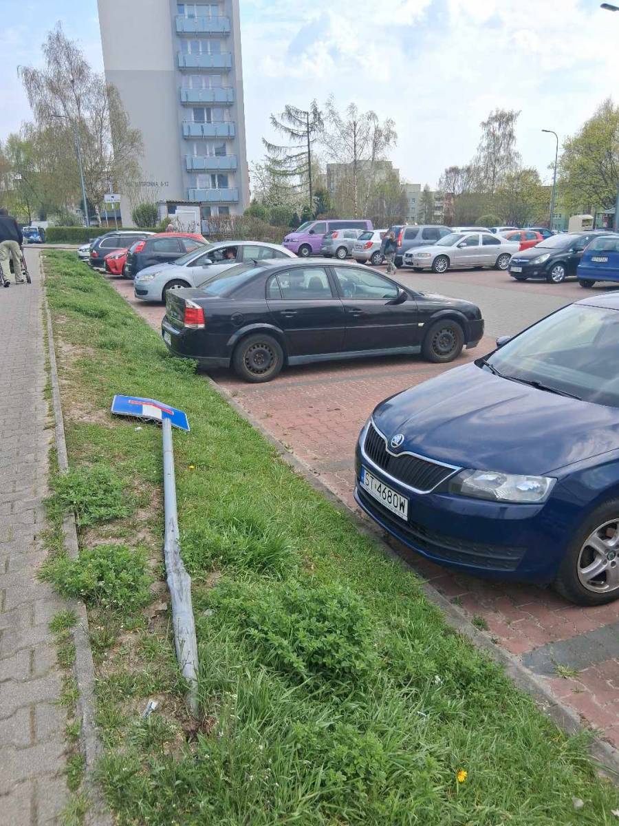 Uszkodzony znak drogowy D-4a przy wjeździe na ulicę Ustronną podczas zdarzenia drogowego.