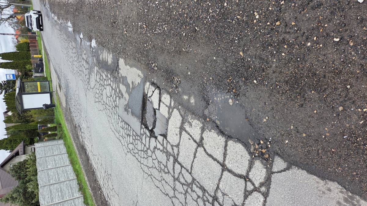 Od przystanku Tychy Zwierzyniecka do ul. Jodłowej 3 dziury w asfalcie po przeciwnej stronie jezdni niż wiata przystankowa. Zdjęcie przedstawia jedną z nich.